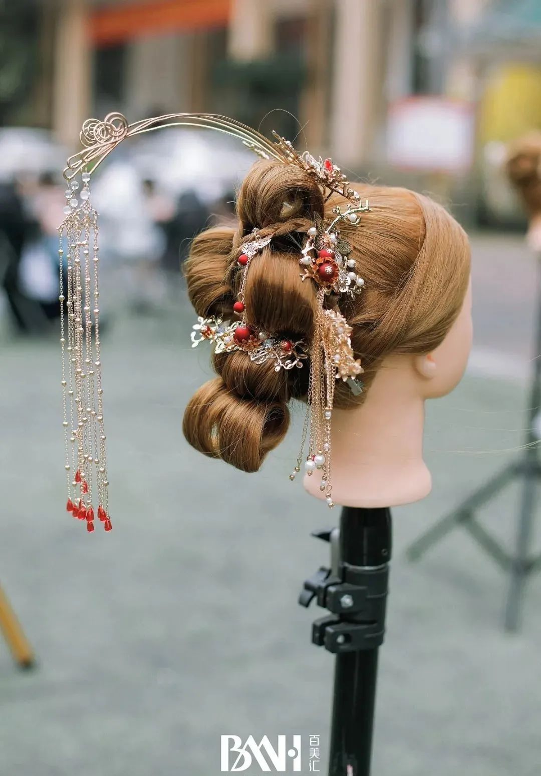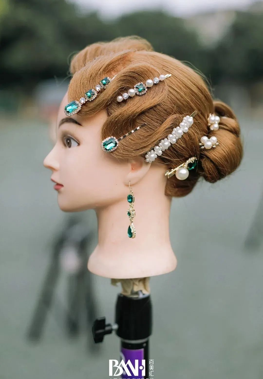 运用卷棒烫卷,手推波盘发,珍珠元素的饰品经典不过时,结合面纱和帽子点缀,高级感满满。