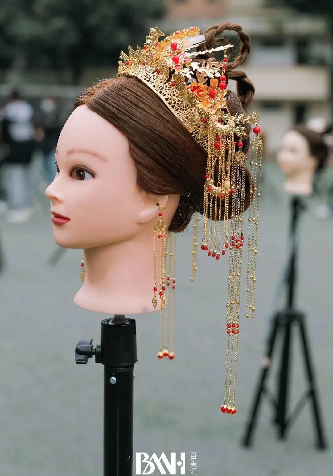 温婉的盘发造型搭配金色的流苏发饰